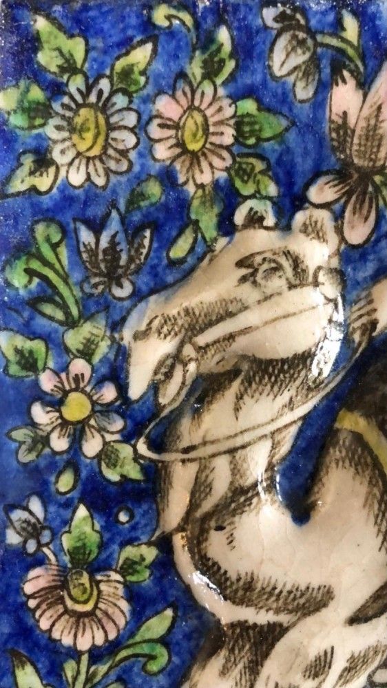 Highly decorative underglaze-painted moulded tile, depicting a rare camel and rider detail, set in a pictorial naturalistic scene.