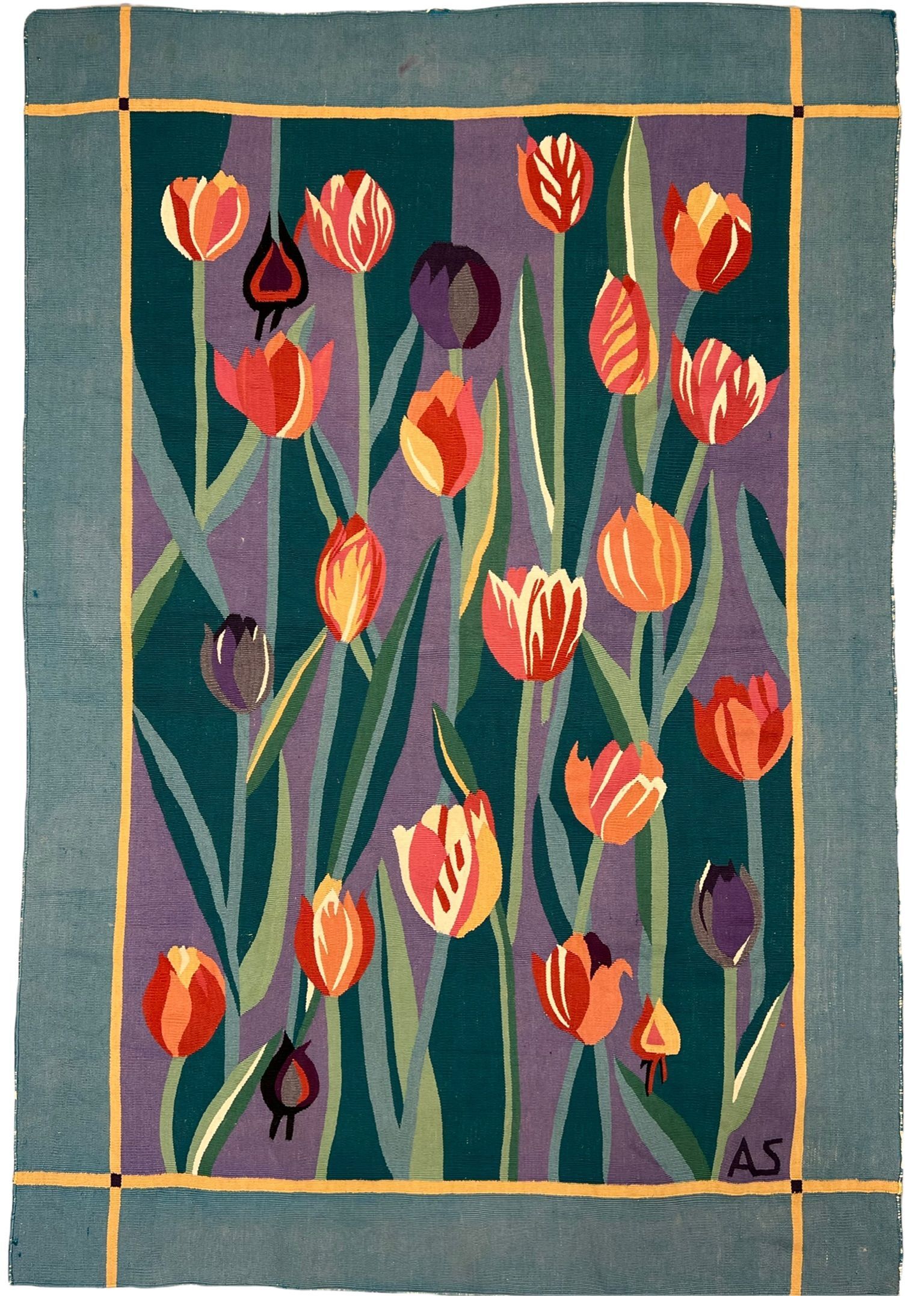 Antique Aubusson kilim with Tulip motives Signed AS Circa 1940